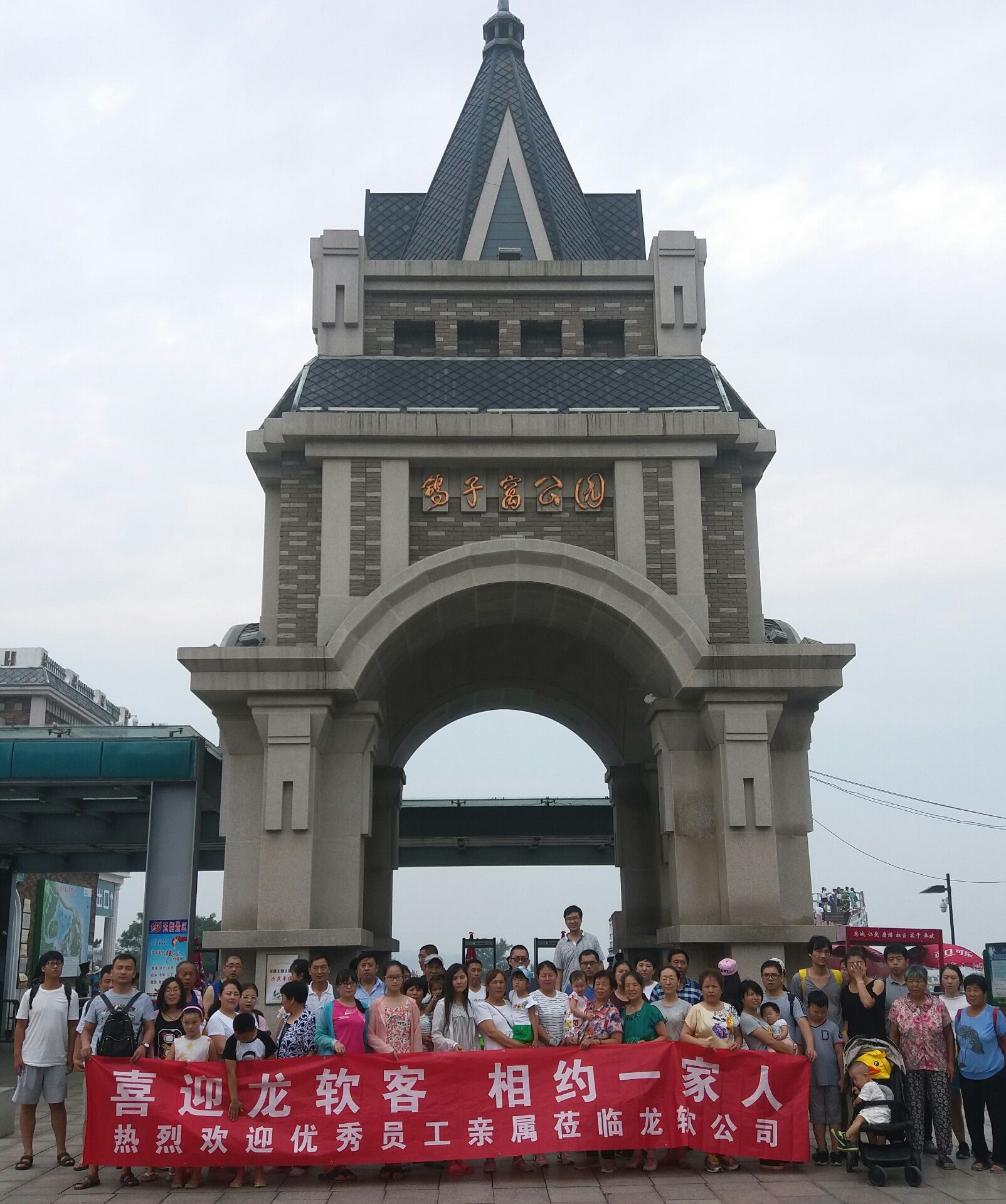 优秀员工及其家属在鸽子窝公园前留念